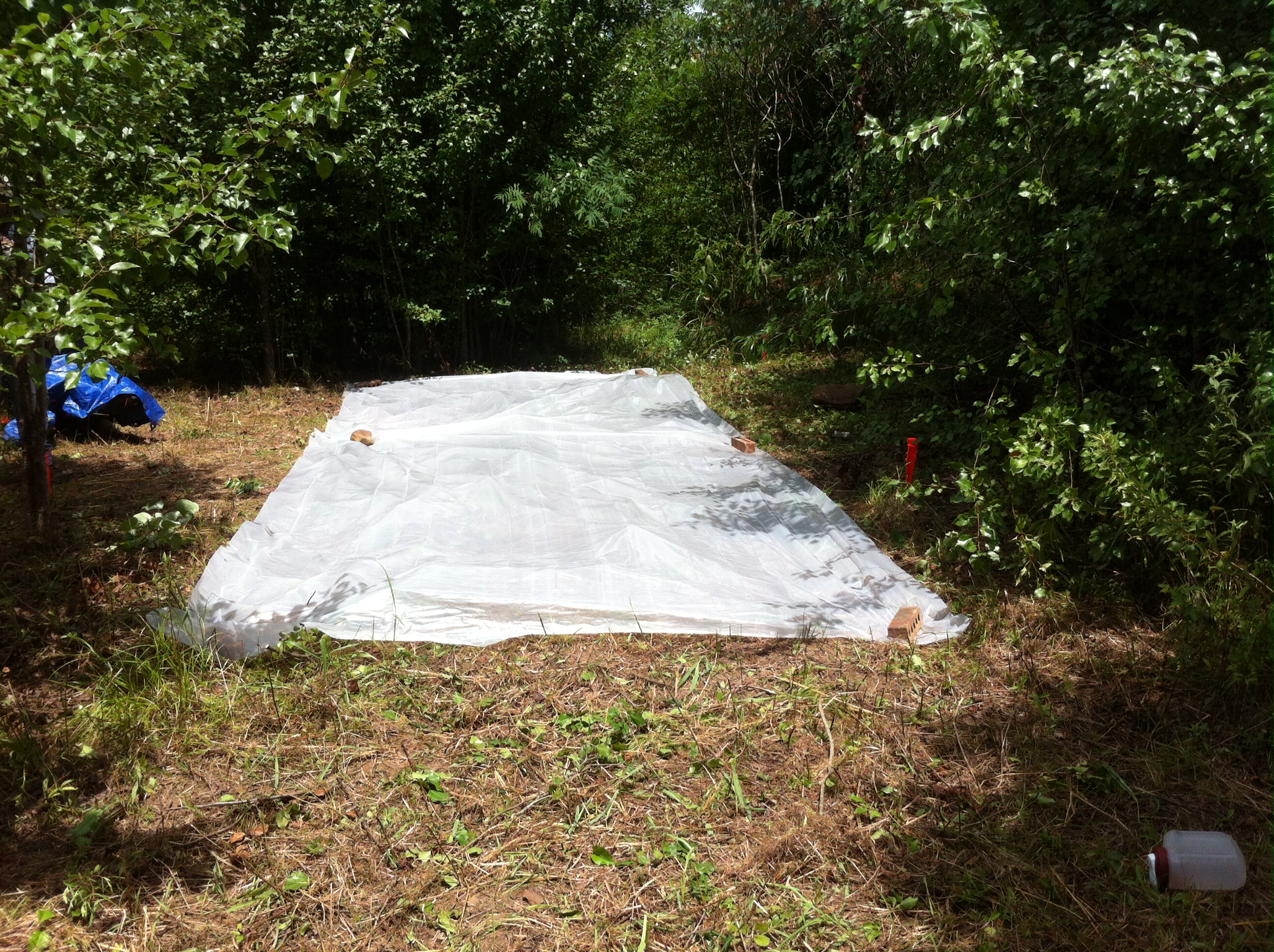 Nevertheless, we’ve cleared enough to put down a sheet of plastic roughly the dimensions of the tiny cabin. This sheet is 10’ X 25’, and our cabin (with porches) will be 16’ X 22’. We still have to remove some stumps, and the impending rain should work in our favor for once–hopefully softening the ground enough for us to pull them out.